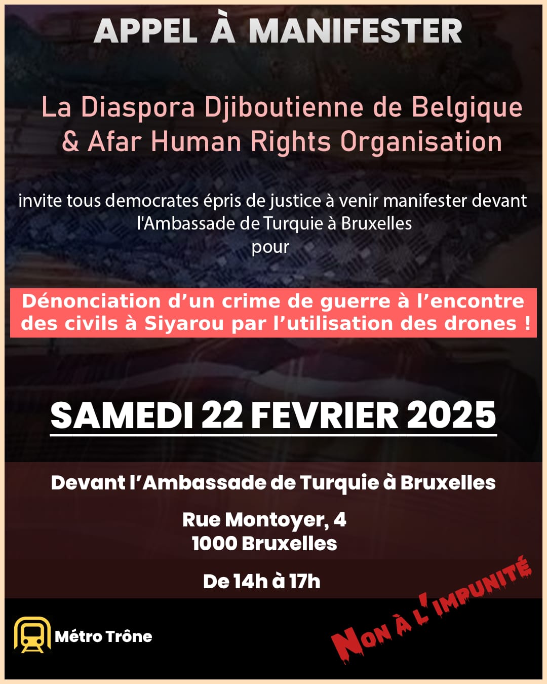 18/02/2025 (Brève 2483) Appel à manifester à Bruxelles à proximité de l’Ambassade de Turquie pour énoncer les attaques mortelles de civils à Djibouti par des Drones turques